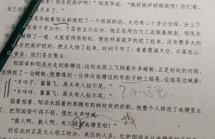 此時正是春耕季節(jié),禾田蒔插已經(jīng)接近尾聲。他們經(jīng)過鬼打五池塘邊,看見路上大人丟下了好多秧苗,鄒茂華說: