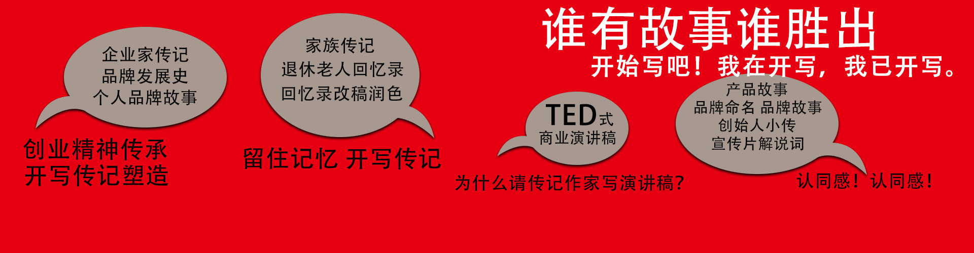 代寫(xiě)傳記回憶錄、個(gè)人品牌故事、企業(yè)品牌故事、企業(yè)文化傳承故事、家風(fēng)傳承故事,特別是創(chuàng)一代企業(yè)家回憶錄。
